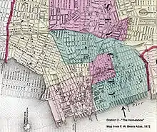 The Horseshoe section of Jersey City, New Jersey, was the second ward, and was the home of the immigrants, tenements, and taverns.[1] The Republican-controlled Legislature gerrymandered the district in 1871 to concentrate and isolate Democratic, and mostly Catholic, votes, thus preserving Republican dominance in the rest of the state.[2] The curved shape of the district was said to resemble a horseshoe.[3]