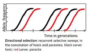 If an allele provides a fitness benefit, its frequency increases within a population – selection is directional or positive. A selective sweep is a form of directional selection where the increase in frequency eventually leads to the fixation of the advantageous allele and other alleles near it. The process is considered to be slower than negative frequency-dependent selection. It may produce an "arms race", consisting of the repeated origin and fixation of new virulence traits in the parasite and new defence traits in the host.[1]