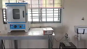 Hot air ovens are electrical devices which use dry heat to sterilize. They were originally developed by Louis Pasteur.[1] Generally, they use a thermostat to control the temperature. Their double walled insulation keeps the heat in and conserves energy, the inner layer being a poor conductor and outer layer being metallic. There is also an air filled space in between to aid insulation. An air circulating fan helps in uniform distribution of the heat. These are fitted with the adjustable wire mesh plated trays or aluminium trays and may have an on/off rocker switch, as well as indicators and controls for temperature and holding time. The capacities of these ovens vary. Power supply needs vary from country to country, depending on the voltage and frequency (hertz) used. Temperature sensitive tapes or biological indicators using bacterial spores can be used as controls, to test for the efficacy of the device during use.