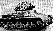 The tank carried about 100 rounds for the gun, and 2,400 rounds for the coaxial 7.5 mm Reibel machine gun – the 37 mm ammunition was racked on the left hand side of the hull, the 7.5 mm ammunition on the right side in fifteen circular magazines with 150 rounds each; with usually an additional magazine on the machine-gun itself.[1] The turret had a rotating cupola with a PPL RX 180 P visor but there was no hatch in the cupola though its top could be lifted a bit for better ventilation. Apart from the cupola there were protected vision devices, a binocular periscope and diascopes, to the front beside the gun and to each side.[5] For access there was a hatch at the back of the turret. When opened, the commander could sit on it for better observation, but this left him very vulnerable and slow to reach the gun. The alternative was to fight closed-up, observing through the vertical slits or the visor of the hatchless cupola. The Cavalry liked neither this arrangement nor the weak gun. The latter problem was lessened by enlarging the breech so that special rounds with a larger charge could be used. This increased muzzle velocity to about 600 m/s (2,000 ft/s) and maximum penetration to about 30 mm (1.2 in). Only a small number of the tanks, and limited to the Cavalry, were modified however, because it greatly increased barrel wear. In the spring of 1940 the original diascopes of the Chrétien type were gradually replaced with episcopes, offering more protection.