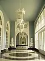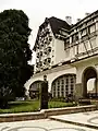 Designed by Italian architect Luis Fossatti,[1] and constructed between 1941 and 1946 by Brazilian entrepreneur Joaquim Rolla,[2] the Palácio Quitandinha is one of the most impressive architectural monuments in Petrópolis. The exterior is in the Norman-French style,[3] while the interior is a mix of Brazilian Baroque and Art Deco.[1] The surface area of the hotel is 50 thousand square meters. It has six floors, with a 10 meter high ground floor. It has 440 rooms plus 13 suites with decor by Dorothy Draper.[4]