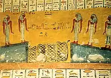 Celebrations in the house of eternity were already being conducted by the time of the Old Kingdom, in which the tomb owner was surrounded by their friends and family. The associated cult of the dead had fully formed by the time of the Fifth Dynasty. Sacrifices and other temple-offerings were brought to the house of eternity for the most important festivals throughout the year. In this era, there was a feast in honour of the tomb owner and for various deities, which was followed by music and dancing.[2] The collapse of the Old Kingdom is connected with a religious addition to the cult of the dead in the Middle Kingdom of Egypt. With the addition of the Duat, a new three-levelled view of the world was created in writing, with the 'access to the afterlife of the heavens, and the Duat' through the preparation of the non-sovereign cult of the dead among others; and the new evermore commonly used coffin texts.[3]