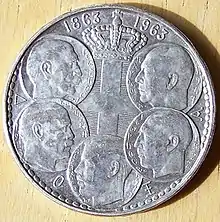 Thirty-drachma coin of 1963, commemorating the centennial of the reign of the House of Glücksburg. Clockwise from the top: Paul, George II, Alexander, Constantine I and George I.