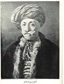 - Sallum al-Dahdah (d. 1820), son of Mussa, administrator in the divan of emir Yusuf Shihab, later mudabbir (or kikhia) of Bashir Shihab II from 1799 to 1817. He left a detailed eye-witness record of the trip of Bashir Shihab II to Egypt to meet Mohammed Ali, which was published in 1920.[65] From the contemporary account of Mikhail Mishaqah about Shaykh Salloum: "Let us return to Emir Bashir. He ruled the land, and his intendent for the affairs of his subjects and for issuing orders within the land was Shaykh Abu Khattar Sallum al-Dahdah, the grandfather of the metropolitan Nimat Allah al-Dahdah who presently occupies the archepiscopal throne in Damascus. He was the first Shaykh of the Dahdah family to be addressed by the emir as "my dear brother".[66][67]