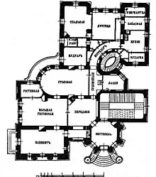 The grandest apartment, which belonged to Horodecki, consisted of a study, a great room and a living room, a dining room, a boudoir, a bedroom, a children's room, a room for a governess, a guest room, three rooms for servants, a kitchen, dishwashing room, bathroom, two toilets, and two storage rooms.[8] On the floor above was an apartment similar in size and design to Horodecki's apartment.[nb 7] The apartment on the top floor had one less room; to make up for this, there was a connecting terrace which provided a panoramic view of the city.[8][nb 8]