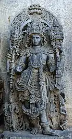 The Hoysaleswara temple is a Shaivism tradition monument, yet reverentially includes many themes from Vaishnavism and Shaktism tradition of Hinduism, as well as images from Jainism.[10] The Hoysaleswara temple is a twin-temple dedicated to Hoysaleswara and Santaleswara Shiva lingas, named after the masculine and feminine aspects, both equal and joined at their transept. It has two Nandi shrines outside, where each seated Nandi face the respective Shiva linga inside.[11] The temple includes a smaller sanctum for the Hindu Sun god Surya. It once had superstructure towers, but no longer and the temple looks flat.[12] The temple faces east, though the monument is presently visited from the north side. Both the main temples and the Nandi shrines are based on a square plan.[13] The temple was carved from soapstone. It is notable for its sculptures, intricate reliefs, detailed friezes as well its history, iconography, inscriptions in North Indian and South Indian scripts. The temple artwork provides a pictorial window into the life and culture in the 12th century South India. About 340 large reliefs depict the Hindu theology and associated legends.[10] Numerous smaller friezes narrate Hindu texts such as the Ramayana, the Mahabharata and the Bhagavata Purana. Some friezes below large reliefs portray its narrative episodes.[2][14][11]