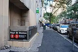 The Hoyt Street station is a local station on the IRT Eastern Parkway Line of the New York City Subway in Downtown Brooklyn, served by the 2 train at all times and 3 train at all times except late nights.