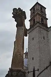 The town itself is oriented east-west, centered on a main plaza.[2][4] On the west side of the plaza is the San Jeronimo parish church, a rustic structure which was extensively renovated in the late 20th century. Its atrium contains a large atrium cross which was sculpted by indigenous hands in the colonial period, possibly those who created the atrium cross at the nearby church in Capacho, with its flower motifs and depiction of arms.[4] On the north side of the plaza is a church where they venerate a Christ figure called the Señor del Amparo, made from joined corn stalks.[4]
