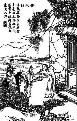 A mule-riding middle-aged woman and a young man pass by a studio. The studio's owner He Shican (何师参), a homosexual, straight away falls in love with the boy, whom he describes as "a quite extraordinary personal beauty".[4] The next day, a besotted He bumps into the boy, who later on introduces himself as Huang Jiulang (黄九郎).[5] The two develop a friendship and upon inviting him into his residence for a drink, He makes known his affection for Huang. However, his sexual advances towards Huang are unsuccessful and the latter leaves. He is crestfallen and becomes emaciated. Huang soon learns of this; revealing that he too is gay, he reluctantly agrees to copulate with He, on the condition that he procures some medicine for Huang's ailing mother.[6]