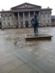 Designed by the architect James Pigott Pritchett and built by the firm of Joseph Kaye in 1846–50[3][4] using the neo-classical style, the station is well known in architectural circles for its classical-style facade, with a portico of the Corinthian order, consisting of six columns in width and two in depth, which dominates St George's Square. It faces out towards Lion Buildings. It is a Grade I listed building.[2] In the 1880s, the station was extended with the installation of an island platform with an overall roof. The roof partially collapsed on 10 August 1885, killing four people.[5]