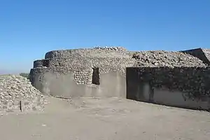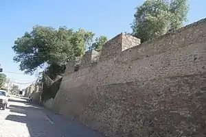 This structure represents remains of a defensive wall that probably surrounded the city. The structure measures about 6 meters high; with battlement protrusions extending two to three meters above. The walls are tapered with a width of about three meters at the bottom tapering down to about one meter at the top.[1]