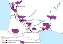 In 1621, Louis XIII moved to eradicate what he considered an open rebellion against his power. He led an army to the south, first succeeding in capturing the Huguenot city of Saumur, and then succeeding in the siege of Saint-Jean-d'Angély against Rohan's brother Benjamin de Rohan, duc de Soubise on 24 June.[3] A small number of troops attempted to surround La Rochelle under the Count of Soissons in the Blockade of La Rochelle, but Louis XIII then moved south to Montauban, where he exhausted his troops in the Siege of Montauban.