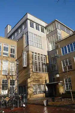 According to an article written by Johannes Bernardus van Loghem in the Architectural weekly "Architectura", the school had been quite dark and depressing with its old northern entrance with little light, and it serviced 1000 girls in 1935, when it was renovated by the architect Dick Greiner.[2] It also contained several small "family kitchen" rooms for cooking classes, and washing nooks for laundry.[2]