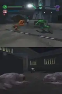 Hulk is a third-person action game in which the player alternatively controls the Hulk and his human alter-ego Bruce Banner; the majority of the game's levels are beat 'em up stages featuring the Hulk, while Banner's levels are based primarily on stealth.[1] The game's narrative follows Banner and the Hulk as they pursue Banner's mentor Professor Crawford, who has betrayed him to assist the Hulk's arch-nemesis the Leader in a plot to unleash an army of gamma-powered mutants upon the world.[2] Both characters have a health meter displayed on the top-left corner of the screen, which is decreased by enemy attacks; the meter's depletion results in the Hulk's defeat or Banner transforming into the Hulk, thus failing the current objective.[3] Health can be restored by collecting green orbs, while collecting blue orbs allows the player to resume progress from a checkpoint rather than the beginning of the level if health is depleted.[4]