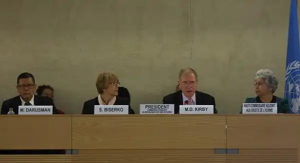 On May 6, 2013, the United Nations Human Rights Council announced an appointment of Michael Kirby of Australia, Sonja Biserko of Serbia, and Marzuki Darusman of Indonesia as members of the United Nations Commission of Inquiry on Human Rights in the Democratic People's Republic of Korea.[16]