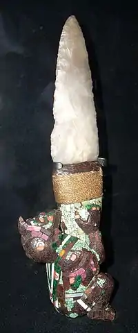 Human sacrifice rituals were performed at the appropriate times each month or festival with the appropriate number of living bodies, and other goods. These individuals were previously chosen to be sacrificed, as was the case for people embodying the gods themselves, or members of an enemy party which had been captured and prepared to be sacrificed.[15] Even enemies of the Aztecs understood their roles as sacrifices to the gods since many also practiced the same type of religion. For many rites, the victims were expected to bless children, greet and cheer passers-by, hear people's petitions to the gods, visit people in their homes, give discourses and lead sacred songs, processions and dances.[17]