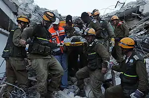 The Israel Defense Forces team extracts a person, who was trapped under the rubble from the government building in Port-au-Prince, Haiti, on January 17, 2010.