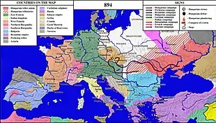 In 881, the Hungarians and the Kabars invaded East Francia and fought two battles, the former (Ungari) at Wenia (probably Vienna)[7] and the latter (Cowari) at Culmite (possibly Kulmberg or Kollmitz in Austria).[8] In 892, according to the Annales Fuldenses, King Arnulf of East Francia invaded Great Moravia and the Magyars joined his troops.[4][7] After 893, Magyar troops were conveyed across the Danube by the Byzantine fleet and defeated the Bulgarians in three battles (at the Danube, Silistra and Preslav).[6] In 894, the Magyars invaded Pannonia in alliance with King Svatopluk I of Moravia.[4][7]