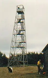 A wooden fire tower had been in existence at the summit since the state's Forest, Fish and Game Commission built it in 1909, during Fenwick's logging operations, but once those ended it was replaced by a steel one in 1917, then the current one in 1953. At that time, the location of the tower was changed from a smaller clearing 0.2 miles (0.32 km) east of the summit to its current location. The footings at this location, a trail junction, are still visible and sometimes cause confusion as to whether this is, in fact, the mountain's actual summit.