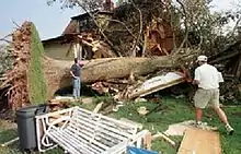 One direct death occurred in North Carolina; a young girl was killed when a tree fell on her Currituck County home. Throughout eastern portions of the state, trees and powerlines were downed, and there were reports of structural damage.[1] Numerous docks, piers and bulkheads were either damaged or destroyed, including the Iron Steamer and Indian Beach piers, which both lost large sections to the strong wind and surf.[46] Due to the winds, the Brunswick Community Hospital lost about 3,000 sq ft (280 m2). of roof and an air conditioner.[47] The storm left about 500,000 people in the state without electric power.[40] In some areas, vegetative and structural debris accumulated in piles several feet deep; it is reported that thick underbrush prevented the debris from traveling further inland.[48] Wilmington "turned into a disaster zone", with flooded highways, and downed trees lying across roadways.[49] Crop, particularly tobacco, damage was extensive.[46] According to then-governor Jim Hunt, "You fly along and don't see much damage to the beach houses, and it's easy to think we didn't have much damage. But then you look at the tobacco in fields and you know the damage has been extensive." The crop losses accounted for much of the overall damage.[50] Forty-seven of those who failed to evacuate in time sought shelter in the Bald Head Island lighthouse as the worst of the storm bore down.[51] Despite the effects, Bonnie's impact was actually less than originally predicted.[52] Overall, property damage in the state is estimated at $240 million (1998 USD), with significantly higher crop damages.[1]