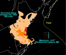 A total of 7.71 inches (196 mm) of precipitation fell in Portland, Maine within 24 hours, 3.13 inches (80 mm) of which fell in only 6 hours. Subsequently, Hurricane Daisy set a then-record the highest 24‑hour rainfall total for Portland; however, this record was broken during Hurricane Bob in 1991.[7] The overall rainfall total for Portland was 9.47 inches (0.241 m) at the international jetport.[1] In Auburn and Lewiston, a total of 4.58 inches (116 mm) of rain fell. The Androscoggin River overflowed and flooded a road in the former. Two fatalities were reported in Maine.[7] Throughout New England, thousands fled after homes, buildings, and school began to flood. It was considered the worst flood in the region since Hurricane Diane in 1955, and was caused partially because falling leaves clogged drains.[6]