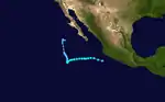 Early on September 25, the National Hurricane Center began monitoring an area of disturbed weather a few hundred miles south of Acapulco, Mexico.[68] This system originally lacked a well-defined center and was broad in size, but gradually organized as it moved towards the north-northwest.[69] Satellite, ship, and buoy observations early on September 28 revealed that the low had become much better defined, and at 1500 UTC, the first advisory was issued on Tropical Storm Norman, located at the time about 85 mi (135 km) east of Cabo San Lucas, Mexico.[70] Norman weakened as it approached the coast of western Mexico and it became a tropical depression on September 29.[71] The depression made landfall about just west of Topolobampo, but quickly emerged into the Gulf of California.[72] The last of the deep convection associated with Norman dissipated early on September 29,[73] and Norman became a post-tropical remnant low later that day.[74] Early on September 30, the remnant low of Norman dissipated.[75][76]