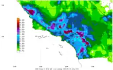 As a tropical cyclone, Dolores produced no impacts in the United States. However, a surge of moisture associated with the remnants of the cyclone moved northward ahead of a trough off the Californian coast between July 17 and 18.[1] The interaction of the moisture with the trough brought record–breaking rainfall and heavy thunderstorms to Southern California, including major cities such as San Diego and Los Angeles. Record monthly rainfall totals include 1.70 in (43 mm) in San Diego, 1.30 in (33 mm) in Los Angeles, and 1.16 in (29.5 mm) in Paso Robles. In the foothills and mountains of east San Diego County, rainfall exceeded 4 in (100 mm).[24][25] This rain assisted firefighters in containing the North Fire,[26] but also resulted in debris flows and rock slides that damaged about 90 homes and submerged cars.[1] The San Diego River reached levels of 8.9 ft (2.7 m)—just below flood stage—and overflowed its banks in a few areas.[1]