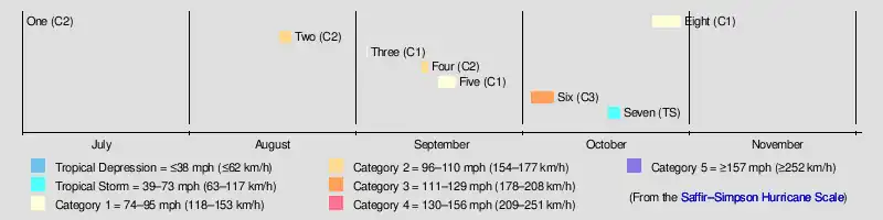 The season's activity was reflected with an accumulated cyclone energy (ACE) rating of 56.[1] ACE is, broadly speaking, a measure of the power of the hurricane multiplied by the length of time it existed, so storms that last a long time, as well as particularly strong hurricanes, have high ACEs. It is only calculated for full advisories on tropical systems at or exceeding 39 mph (63 km/h), which is tropical storm strength.[3]