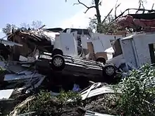 Moderate rainfall from Kyle in South Carolina peaked at 6.35 inches (161 mm) in Edisto Beach, with the precipitation resulting in minor urban flooding.[1] In and around St. Stephen, flooding reached several feet in depth in roads and buildings; there, a nursing home had to be evacuated because of flooding.[36] High waters in Manning severely damaged 17 mobile homes, forcing about 50 people to move to shelters.[37] Ten car accidents were reported in Florence.[38] The tropical storm spawned an F2 tornado in Georgetown that remained on the ground for about 1.25 miles (2.01 km). At its peak strength, the tornado overturned five mobile homes and a car.[39] The tornado destroyed seven homes and damaged 106 buildings, 28 severely. Eight people were injured by the tornado.[40]
