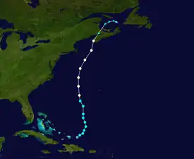 By September 24, it began to track northward away from the islands, and developed enough strong thunderstorm activity near its center and a well-defined enough circulation to be deemed a tropical storm on September 25. It strengthened to a hurricane on September 27 west of Bermuda. It made landfall in Nova Scotia as a Category 1 hurricane late on September 28, then became extratropical shortly afterward.