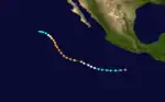 Lidia originated from a disturbance that entered the basin on August 28. It remained south of the Mexican coast in an area of warm sea surface temperatures, and at 1800 UTC August 29, Tropical Depression Fifteen formed.[5] It intensified into a tropical storm six hours after development about 860 mi (1,385 km) away from Baja California Sur. Lidia moved northwest, paralleling the Mexican coast. It edged in a more westerly direction for a day before resuming its northwesterly path, and reached hurricane intensity on 0600 UTC September 1.[3] At its strongest on September 1 based on intensity estimates via Dvorak classifications, Hurricane Lidia had a wind speed of 85 mph (135 km/h).[5] Shortly thereafter, Lidia began weakening and lost hurricane intensity on September 2.[3] Lidia weakened very rapidly over cold water.[5] Early the next day, Lidia weakened to a tropical depression[3] and dissipated over 76 °F (24 °C) waters on 1200 UTC September 3.[5] The remnants of the storm; however, brought showers to California.[24] One woman was injured by a lightning strike.[25]