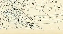 Minor effects were reported away from the coast; the mountainous terrain of Hispaniola greatly weakened the hurricane, which prevented significant amounts of further deaths or damage.[2] Effects in the mountainous areas included downed trees and crop damage.[10] In Haiti, the hurricane produced locally gusty winds and heavy amounts of rainfall, though exact damage details for the nation are unknown.[8] Despite crossing the island of Cuba, no damage or deaths were reported there. Upon moving through the U.S. state of Florida, the storm remained severely weakened; during its passage a pressure of 1,006 mbar (29.7 inHg) was reported in Tampa, the lowest pressure in the state. The threat of the hurricane prompted the National Weather Bureau to issue storm warnings from Southport, North Carolina through the Virginia Capes. The strongest winds remained offshore, with minor damage reported along the Outer Banks. On Cape Lookout, the hurricane downed 12 small-frame buildings and damaged the city's Coast Guard headquarters. Power outages were also reported, leaving some areas on the Outer Banks isolated from communication to the outside world.[10]