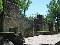 Hurstville was an industrial complex and a company town. It was a major lime supplier in the state of Iowa for masonry building and bridge construction in the Midwest.[2] Alfred Hurst built the first kiln in 1871, and the other three followed soon after. The whole operation grew to include 3,000 acres (1,200 ha) and 50 employees.[3] The property included timber, which was used in the kilns. Hurst organized the Maquoketa and Hurstville Railroad in 1888 to ship the burned lime instead of hauling it by wagon. The limestone was quarried to the east of the kilns across the North Fork of the Maquoketa River. It was brought to the kilns by way of a narrow-gauge railway. A bridge, which collapsed into the river in the 1970s, was built over the river around 1900. By the 1920s the increased use of Portland cement by the construction industry affected the lime industry. The last time all four kilns were used at the same time was 1920, and the kilns were shut down in 1930 when William Hurst, Alfred's son, died.[3]