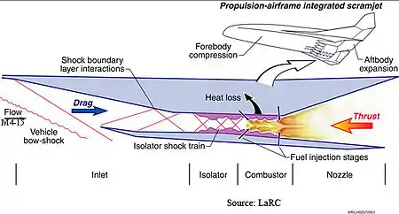 Schematic of a dual-mode scramjet indicating engine processes and components. Source: NASA Langley