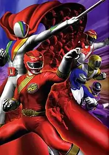 Hyakujuu Sentai Gaoranger vs. Super Sentai (百獣戦隊ガオレンジャーVSスーパー戦隊, Hyakujū Sentai Gaorenjā tai Sūpā Sentai) is a Super Sentai Series V-Cinema movie which celebrates the 25th anniversary of the Super Sentai Series, released August 10, 2001. It features a team up of the protagonists of Hyakujuu Sentai Gaoranger with previous heroes of the Super Sentai Series over its twenty-five year history. This movie would be the inspiration for the Power Rangers Wild Force episode Forever Red.