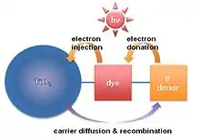 TiO2 nanoparticles are synthesized in several tens of nanometer scales (~100 nm). In order to make a photovoltaic cell, molecular sensitizers (dye molecules) are attached to the titania surface. The dye-absorbed titania is finally enclosed by a liquid electrolyte. This type of dye-sensitized solar cell is also known as a Grätzel cell.[25] Dye-sensitized solar cell has a disadvantage of a short diffusion length. Recently, supermolecular or multifunctional sensitizers have been investigated so as to enhance carrier diffusion length.[26] For example, a dye chromophore has been modified by the addition of secondary electron donors. Minority carriers (holes in this case) diffuse to the attached electron donors to recombine. Therefore, electron-hole recombination is retarded by the physical separation between the dye–cation moiety and the TiO2 surface, as shown in Fig. 5. Finally, this process raises the carrier diffusion length, resulting in the increase of carrier lifetime.