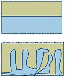 To deal with the problem of the short exciton diffusion length, a bulk heterojunction structure is used rather than a phase-separated bilayer. Dispersing the particles throughout the polymer matrix creates a larger interfacial area for charge transfer to occur.[3] Figure 2 displays the difference between a bilayer and a bulk heterojunction.