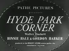 Hyde Park Corner is a 1935 British comedy crime film, directed by Sinclair Hill and starring Gordon Harker, Binnie Hale and Eric Portman. Harker portrays a policeman investigating a crime in 1930s London, which proves to have its origins in the 1780s.[1] The film takes its name from Hyde Park Corner in Central London where the events of the film occur. It was based on a play by Walter C. Hackett. The film was made at Welwyn Studios.