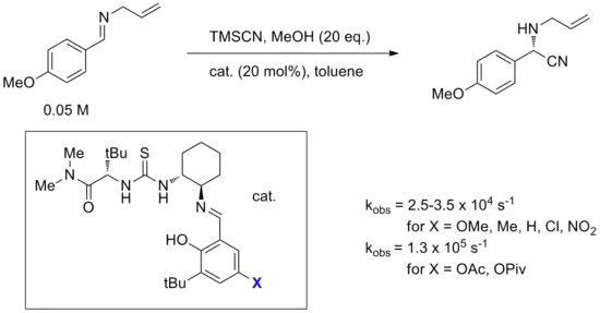 Furthermore, the effect of varying substituents on the catalyst is rarely well understood. Small substituent changes can completely change reactivity or selectivity. An example of this was in the optimization studies of a bifunctional Strecker reaction catalyst, one of the first well-studied thiourea catalysts.[26] Specifically, varying the X substituent on the salicylaldimine substituent, it was found that typical electron-withdrawing or electron-donating substituents had little effect on the rate, but ester substituents such as acetate or pivaloate seemed to cause noticeable rate acceleration. This observation is difficult to rationalize given that the X group is far from the reactive center during the course of the reaction and electronics do not seem to be the cause. In general, despite the relative ease of electronic tuning with organic catalysts, chemists have not yet reached a useful understanding of these modifications.