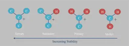 Detailed kinetics of these reactions have not been determined. However, it is known that clay minerals catalyze ionic hydrogen exchange faster than other minerals.[48] Thus hydrocarbons formed in clastic environments exchange more than those in carbonate settings. Aromatic and tertiary hydrogen also have greater exchange rates than primary hydrogen. This is due to the increasing stability of associated carbocations.[49] Primary carbocations are considered too unstable to physically exist and have never been isolated in an FT-ICR spectrometer.[50] On the other hand, tertiary carbocations are relatively stable and are often intermediates in organic chemistry reactions. This stability, which increases the likelihood of proton loss, is due to the electron donation of nearby carbon atoms. Resonance and nearby lone pairs can also stabilize carbocations via electron donation. Aromatic carbons are thus relatively easy to exchange.