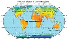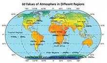 The δD values of the annual precipitation in different regions of the world are shown on the map.[65] The precipitation is more D-enriched near the equator in the Tropical regions. The values of δD generally fall in the range of around −30 ~ -150‰ in the northern hemisphere and −30~+30‰ over the land areas of the southern hemisphere. In North America, the δD values of average monthly precipitation across regions are more negative in January (ranging up to around −300‰ in Canada) compared to July (up to around −190‰).[65]