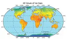 The δD values of ice caps from 70 km south of Vostok Station and in East Antarctica are −453.7‰ and −448.4‰ respectively, and are shown on the map.[58]