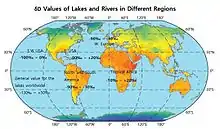 The δD values vs. VSMOW of lakes in different regions are shown on the map.[69] The general pattern observed indicates that the δD values of the surface waters including lakes and rivers are similar to that of local precipitation.[70]
