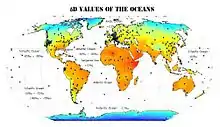 The isotope composition of seawater (not just the surface water) is mostly in the range of 0-(-10) ‰. The estimates of the δD values for different parts of the oceans across the world are shown on the map.[55]