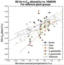 - ↑ Pedentchouk, Nikolai; Sumner, William; Tipple, Brett; Pagani, Mark (2008-08-01). "δ13C and δD compositions of n-alkanes from modern angiosperms and conifers: An experimental set up in central Washington State, USA". Organic Geochemistry. Advances in Organic Geochemistry 2007Proceedings of the 23rd International Meeting on Organic Geochemistry. 39 (8): 1066–1071. doi:10.1016/j.orggeochem.2008.02.005.