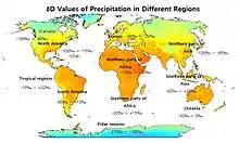 The overall mean precipitation is determined by balance between the evaporation of water from the oceans and surface water sources and the condensation of the atmospheric water vapor in the form of rain. The net evaporation should equal the net precipitation, and the δD value for the mean isotopic composition of global precipitation is around −22‰ (global average).[66] The Global Network of Isotopes in Precipitation (GNIP) investigates and monitors the isotopic composition of precipitation at various sites all over the world. The mean precipitation can be estimated by the equation, δ2H = 8.17(±0.07) δ18O + 11.27(±0.65)‰ VSMOW. (Rozanski et al., 1993) This equation is the slightly modified version from the general 'Global Meteoric Water Line (GMWL)' equation, δ2H = 8.13δ18O + 10.8, which provides the average relationship between δ2H and δ18O of natural terrestrial waters.[66][67]