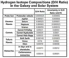 Due to physical and chemical fractionation processes, the variations in the isotopic compositions of elements are reported, and the standard atomic weights of hydrogen isotopes have been published by the Commission on Atomic Weights and Isotopic Abundances of the IUPAC. The ratios of stable H isotopes are reported relative to the International Atomic Energy Agency (IAEA) reference water. In the equilibrium isotope reactions of Hydrogen and Deuterium in general, enrichment of the heavy isotope is observed in the compound with the higher oxidation state. However, in our natural environment, the isotopic composition of hydrogen isotopes greatly vary depending on the sources and organisms due to complexities of interacting elements in disequilibrium states. In this section, the observed variations in hydrogen isotope abundances of water sources (hydrosphere), living organisms (biosphere), organic substances (geosphere), and extraterrestrial materials in the Solar system are described.