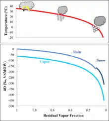 2O is faster than 1HD16O due to a higher vapor pressure. On the other hand, the rain water (precipitation) is in general more enriched than the atmospheric water vapor.[62][63]