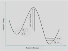 The effects of this energy distribution manifest in the kinetic isotope effect and the equilibrium isotope effect.[45] In a reversible reaction, under equilibrium conditions, the reaction will proceed forwards and backwards, distributing the isotopes to minimize thermodynamic free energy. Some time later, at equilibrium, more heavy isotopes will be on the product side. The stability of the lower energy drives the products to be enriched in deuterium relative to reactants. Conversely, under kinetic conditions, reactions are generally irreversible. The limiting step in the reaction is overcoming the activation energy barrier to reach an intermediate state. The lighter isotope has a higher energy state in the quantum well and will thus be preferentially formed into products. Thus under kinetic conditions the product will be relatively depleted in deuterium.