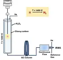 Measurements of individual compounds was made possible in the late 1990s and early 2000s with advancements in mass spectrometry.[28] The Thermo Delta+XL transformed measurements as the first instrument capable of compound specific isotope analysis. It was then possible to look at smaller samples with more precision. Hydrogen isotope applications quickly emerged in petroleum geochemistry by measuring oil, paleoclimatology by observing lipid biomarkers, and ecology by constructing trophic dynamics. Modern advances are currently underway in the clumped isotope composition of methane[29] after development of the carbonate thermometer.[30][31] Precise measurements are also enabling focus on microbial biosynthetic pathways involving hydrogen.[32] Ecologists studying trophic levels are especially interested in compound specific measurements for construction of past diets and tracing predator-prey relationships.[33] Highly advanced machines are now promising position specific hydrogen isotope analysis of biomolecules and natural gases.[34]